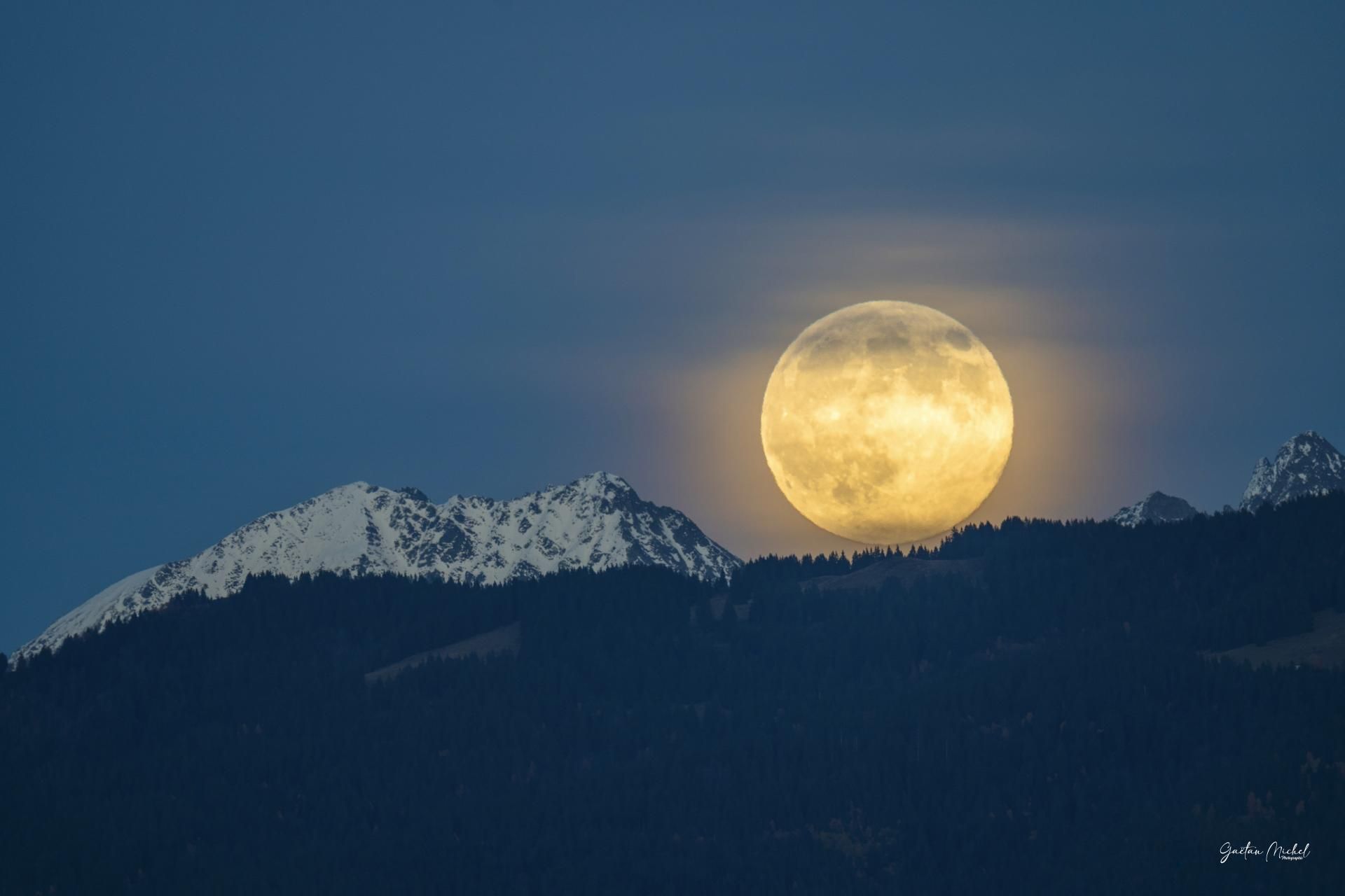 Super Lune majestueuse se levant au-dessus des crêtes du massif de Belledonne, à la frontière entre le département de l’Isère et la Savoie. Sa lumière dorée, amplifiée par sa proximité avec la Terre, enveloppe les sommets enneigés d’une atmosphère douce et silencieuse. Dans le calme du crépuscule, la Lune semble effleurer les montagnes.