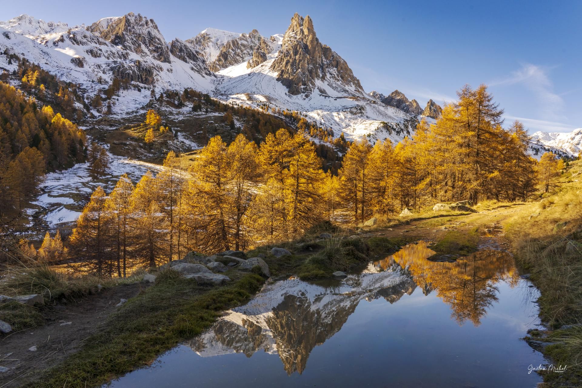 Dans de la vallée de la Clarée, au coeur des Hautes-Alpes les mélèzes en feu se mêlent aux premières neiges des sommets. Dans le calme de l’altitude, une flaque d’eau devient miroir, reflétant la silhouette acérée de la Main de Crépin sous la lumière dorée du soir.