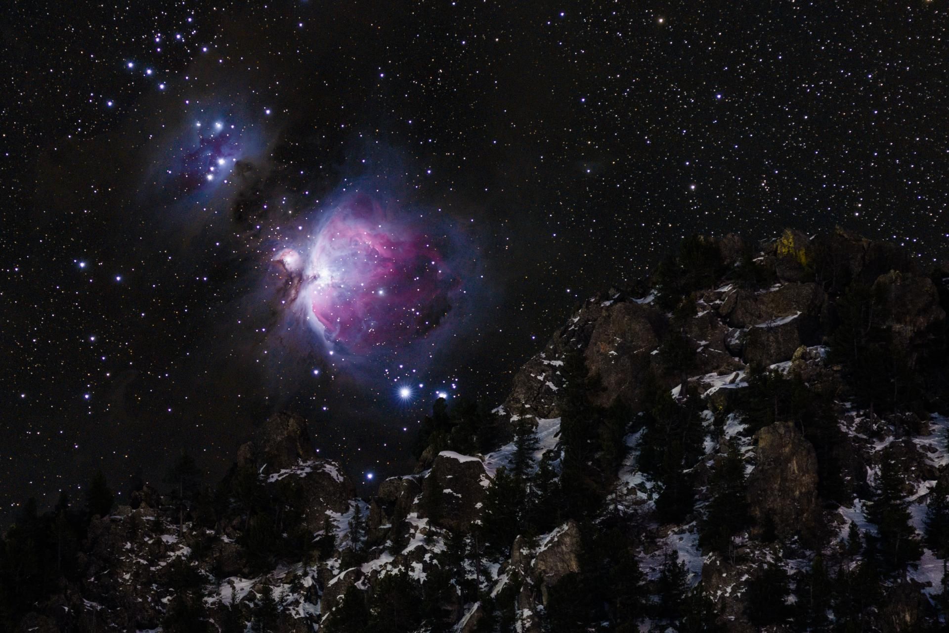 Lever de la nébuleuse d'Orion derrière les montagnes de Montgenèvre, dans les Alpes françaises.