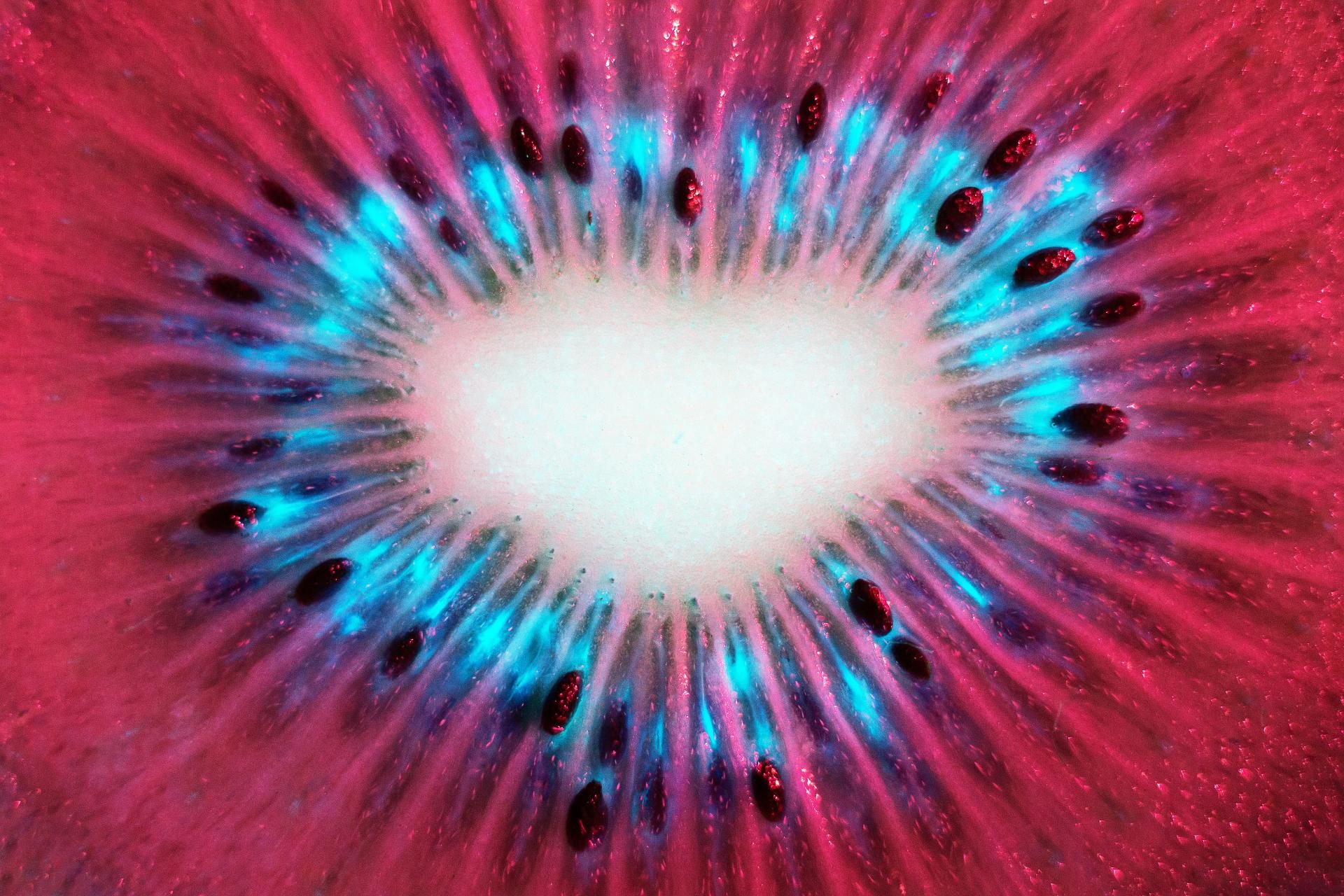 Kiwi en fluorescence UV, photographie macro sous éclairage scientifique.