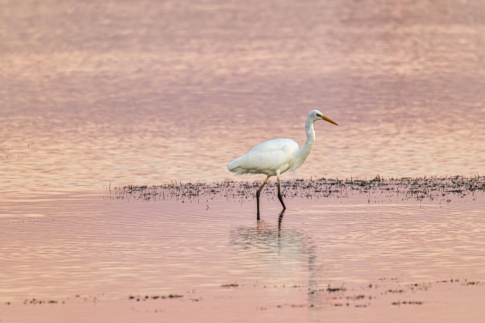 Aigrette garzette au petit levé du jour ou l'eau du marais est rose