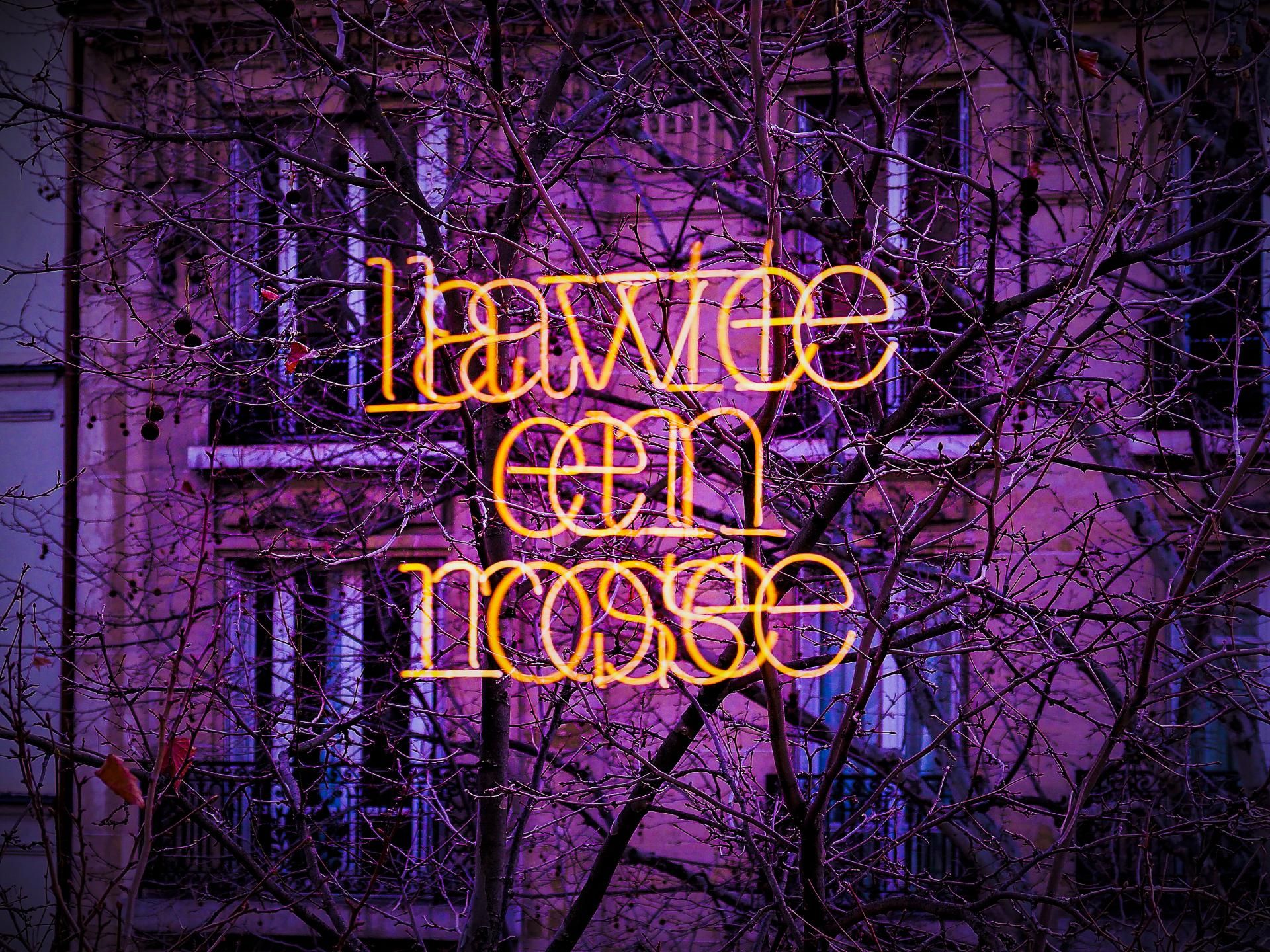 À travers les branches dénudées de l’hiver parisien, un message néon s’élève, vibrant, comme une incantation urbaine : la vie en rose. Suspendue dans l’air, cette lumière rose-orange perce la grisaille d’un immeuble haussmannien, et offre un contraste saisissant entre froideur architecturale et chaleur intérieure.