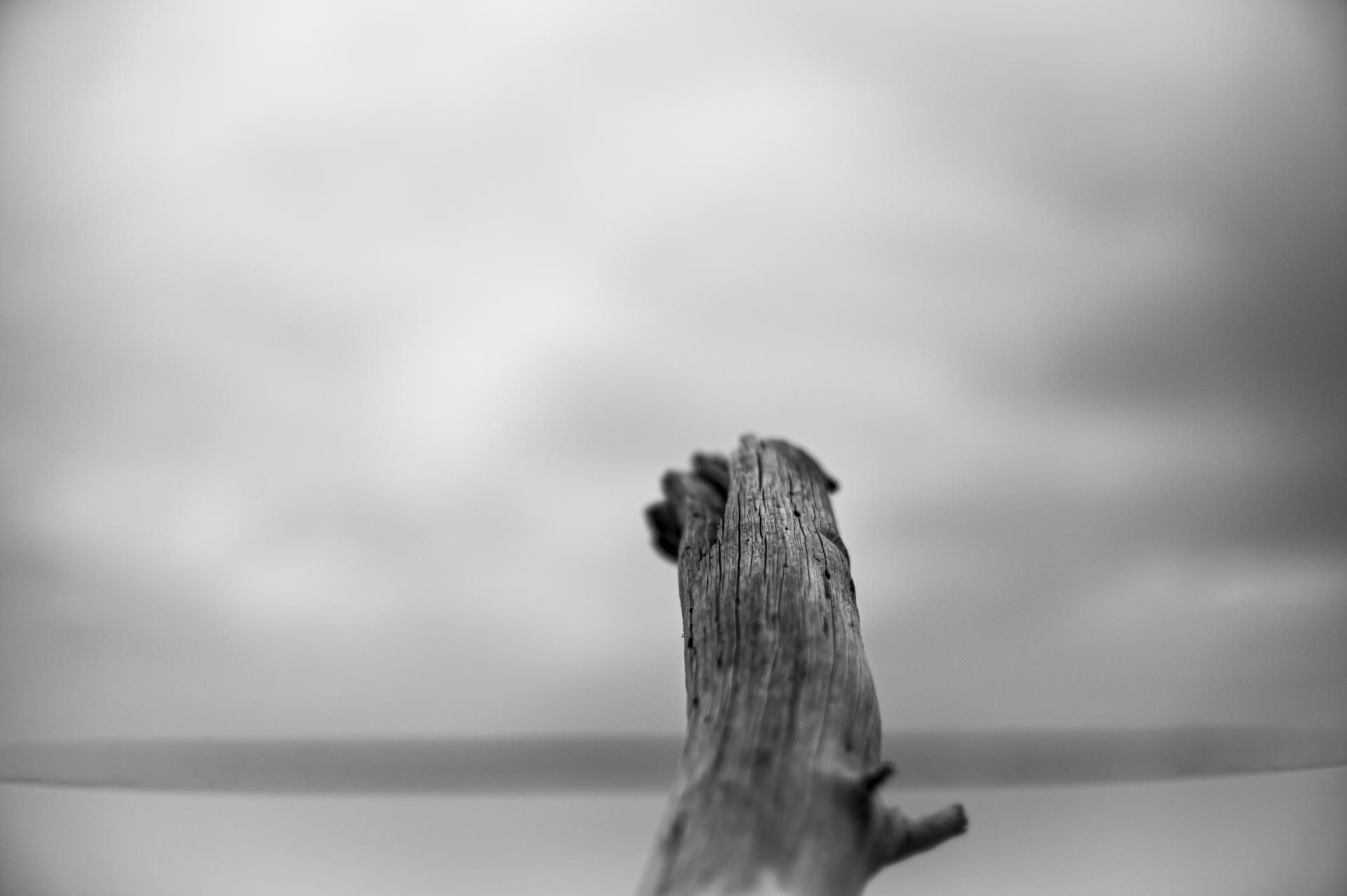 Sur un horizon presque effacé, une branche marquée par le temps et les éléments se dresse en premier plan. Photographié en noir et blanc, il apparaît comme une forme sculpturale, simple et brute, isolée dans un paysage volontairement réduit à l’essentiel. Le ciel, doux et diffus, crée un arrière-plan abstrait qui accentue la présence du bois. Une image minimaliste où la matière devient sujet, et où l’horizon flou ouvre un espace de contemplation. Leica Monochrom et Canon "Dream lens" 0,95/50mm, Ile de Ré, 11 mars 2017.
