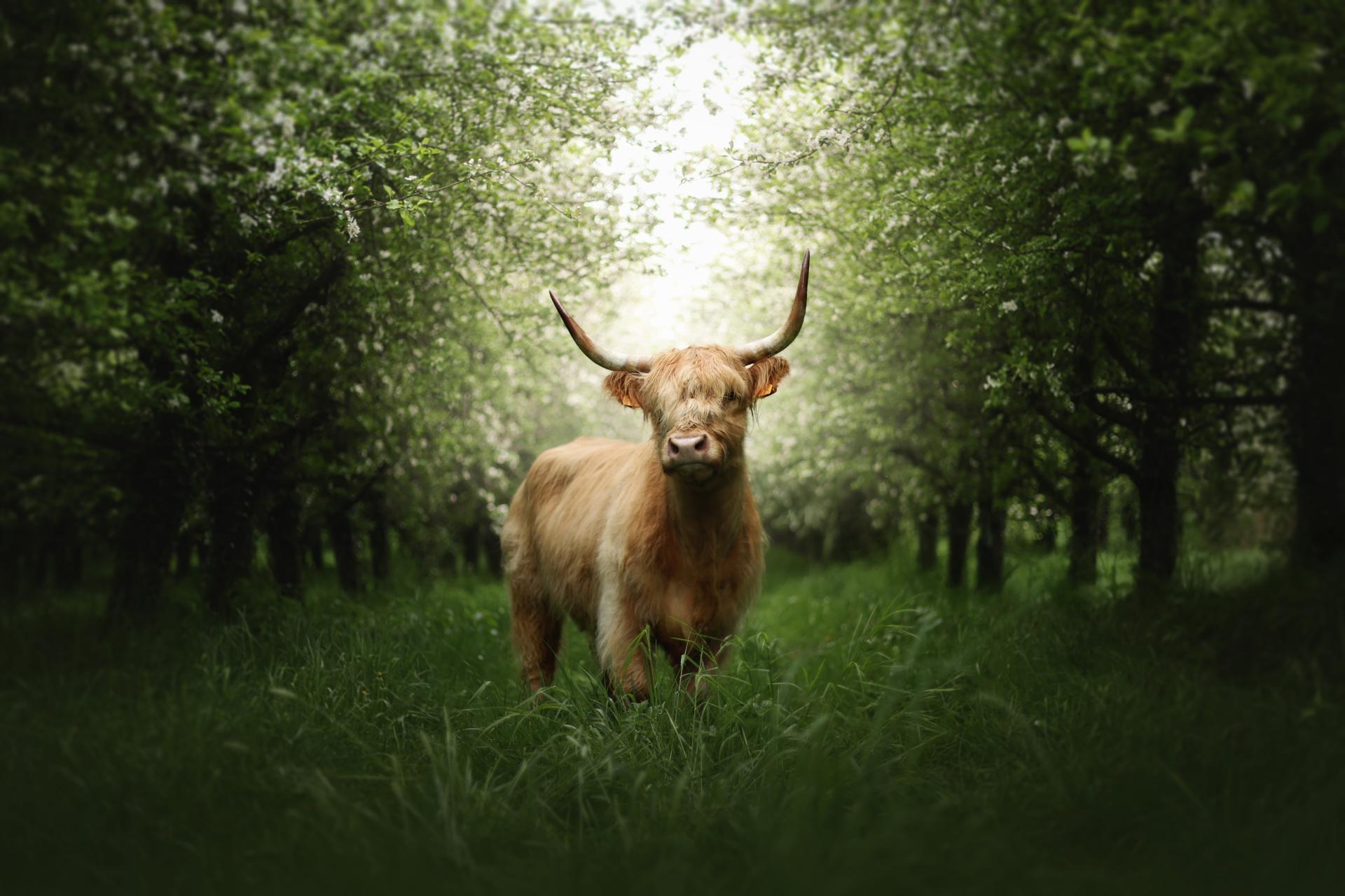 Pâquerette, vache Highland de l'élevage du Bois de la l'eau parmi les pommiers d'un producteur local.