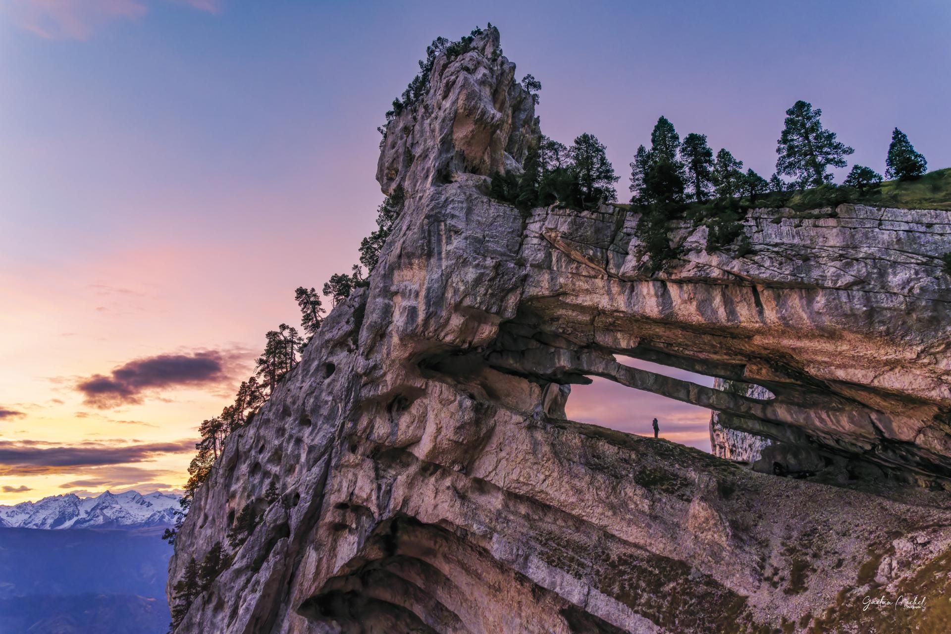 À l’aube, une double arche rocheuse se détache dans la lumière naissante, révélant la puissance minérale du massif de la Chartreuse. Entre falaises calcaires, silhouette humaine et sommets enneigés de Belledonne, la scène invite à la contemplation et au voyage.