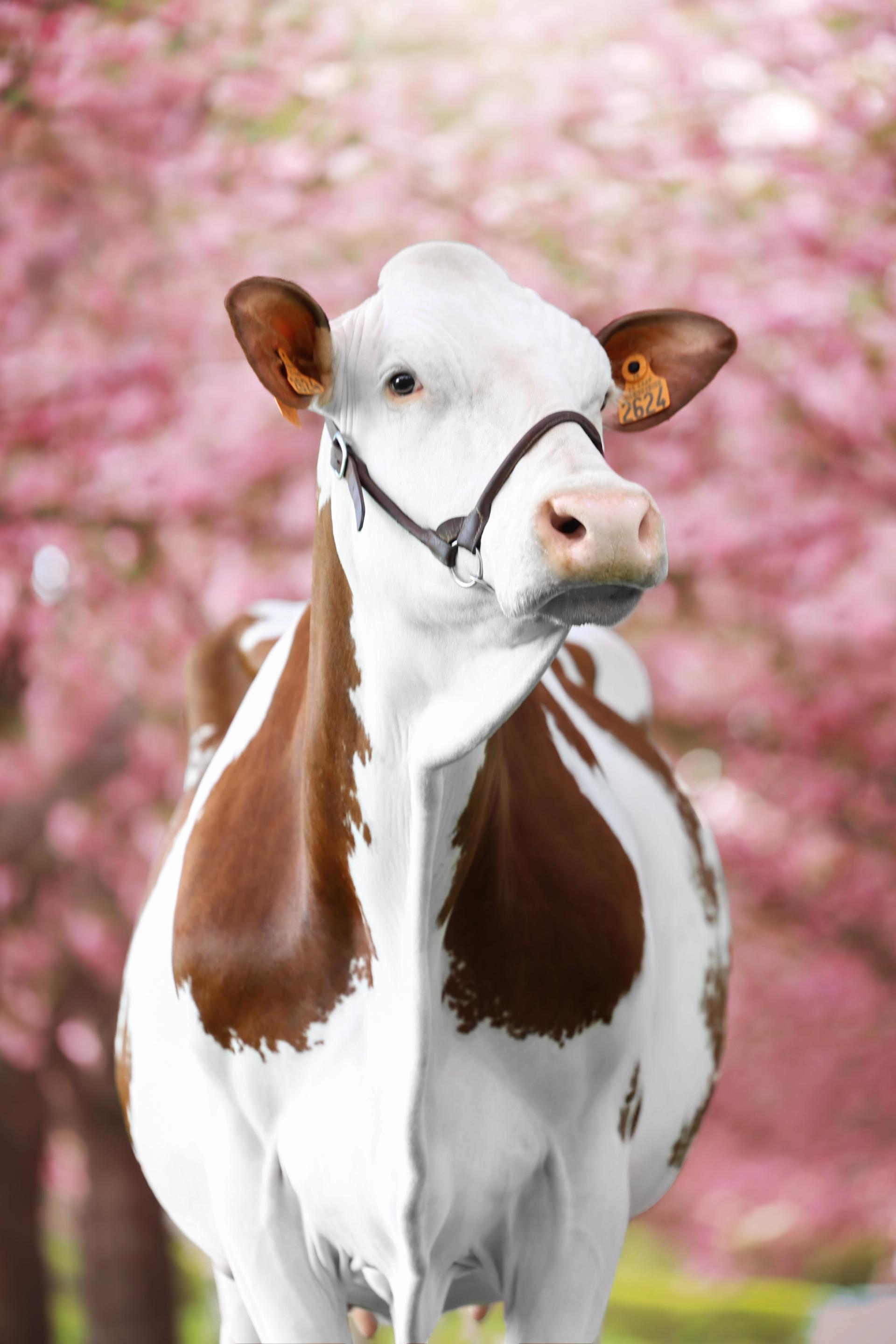 Snow, vache de race Montbéliarde appartenant à la Ferme de la vie de Fer parmi les cerisiers japonais en fleur.