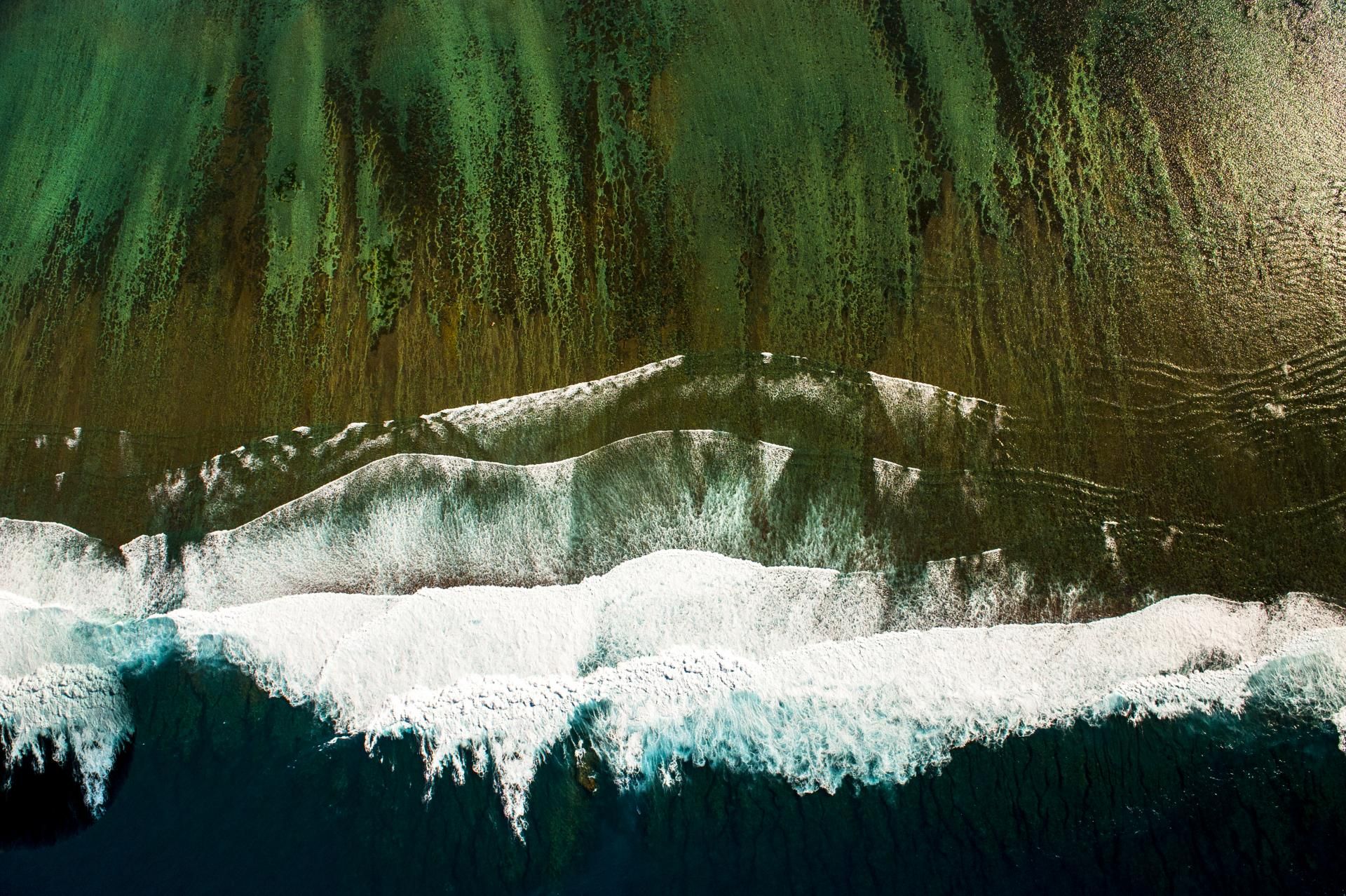 France, La Réunion vue du ciel, les vagues de l'océan indien. Palette de couleurs du littoral, le tableau de verts et bleus qui se fondent au gré des lumières sur l'île intense / Ocean landscape from above in the air over waves picturing impressionism scene, Reunion island